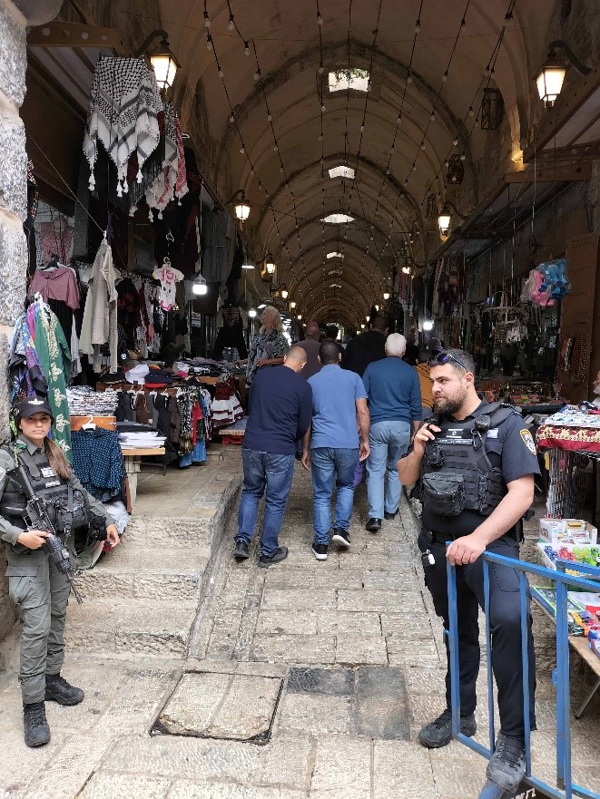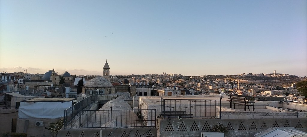 We could not have arrived in Jerusalem as a worse time. It was the evening before Jerusalem Day celebrations commemorating, among other things, the reunification of the city in 1967. On top of that it was the first time in three years that public gatherings were permitted. After considering advise from the Airbnb hosts, and David’s knowledge of the City, we were dropped off at Jaffa Gate and walked to our accommodation. Despite the seething mass of humanity going in the opposite direction we navigated our bags past the Tower of David, down to St James St and found the location at the bottom of Ohr HaHayim. We retrieved the code for the door lock from WhatsApp and made our way up several stairs, and a narrow spiral staircase to the roof-top unit. It was now 11:00pm at night so we climbed into bed and, despite chanting youth on the street below, we fell asleep. In the morning we were greeted by a view across the roof-tops to the Dome of the Rock.