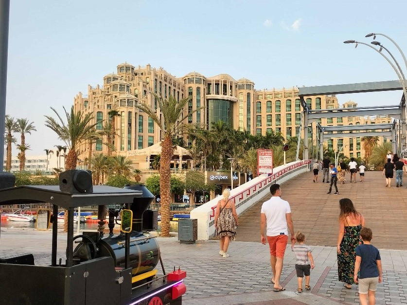 Eilat is a tourist town. It sits on the Red Sea and is the southernmost city in Israel some four hours drive south of Jerusalem via highway 90. It’s a popular place to holiday and to take the children for a break. It has beaches all kinds of restaurants many large hotels and amusement rides. It is a rapidly growing city with much construction of more vacation experiences and hotels underway. It’s also a port, the only Israeli port on the Red Sea, and it’s a free trade zone for transiting cargo.