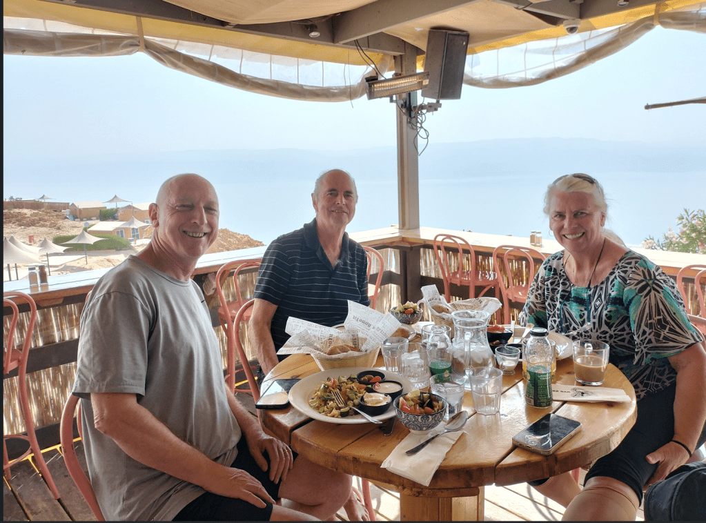 David is a friend from primary school who had tracked me down via the secondary school I had attended in England. He was the reason for our trip to Israel, our previous two attempts being thwarted first by the Cunard Cruise line and then by COVID. David turned out to be gregarious and we soon hit it off. He drove us to Ein Bokek on the Dead Sea. We had a reservation at the largest hotel, the Royal Dead Sea Hotel and Spa. We checked in and proceeded to our room. The extravagance of the hotel facade soon faded as we got out of the elevator and attempted to find our room along corridors with room numbers missing and carpets fraying. We eventually succeeded and the card key opened the door to our room. It was a spacious room with a large king-sized bed and an annex with a pullout couch. We climbed into our pajamas and were soon fast asleep.