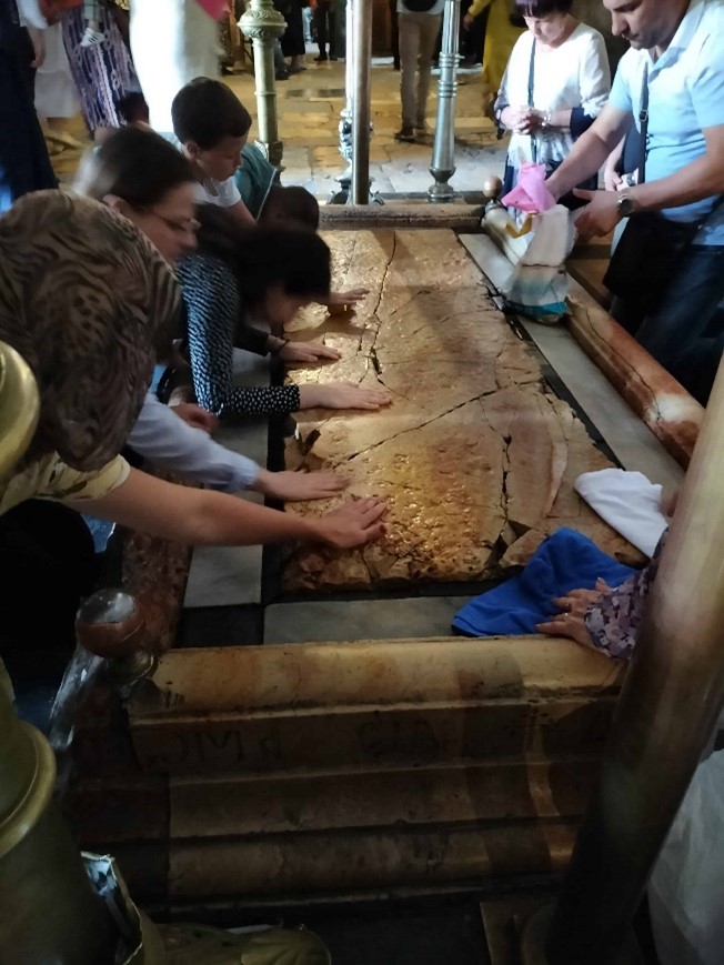 The other landmark we visited was the Church of the Holy Sepulchre. It is a large cathedral with several sections. The building marks the location where Jesus was supposedly buried, although the church was not built until centuries later. There is also the stone where Jesus’s body was supposedly laid in preparation for burial. The cathedral is at the top of the Via Dolorosa where the 12 stations of the cross are located. It’s all rather depressing seeing that none of it existed at the time od Jesus’ trial and crucifixion.